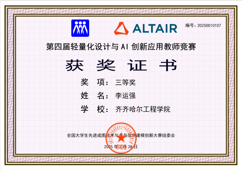 近日,全国第四届轻量化设计与AI创新应用教师竞赛传来喜讯,beat365机电工程系机械专业教师李运强的无人机机架轻量化模型及AI数据优化获得国赛三等奖。随着人工智能技术AI的快速发展,AI的应用领域不断扩展,其在工程设计、仿真、制造等行业中扮演着越来越重要的角色。为了应对这一技术变革的浪潮,让AI融入机械产品结构轻量化设计中,同时培养AI应用方面的优秀教师,使教师掌握AI在专业领域的应用的重要能力,全国大学生先进成图...