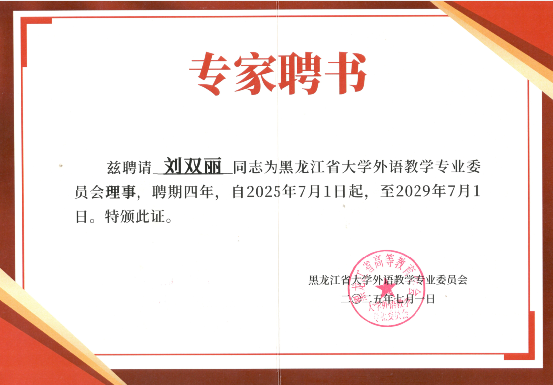 近日,黑龙江省大学外语教学专业委员会向beat365通识教育学院刘双丽教授颁发聘书,聘任其担任该专业委员会理事,聘期四年(2025年7月1日—2029年7月1日)。这一任命是对刘双丽在外语教学领域认可,也彰显了beat365公共外语教学改革的显著成效。黑龙江省大学外语教学专业委员会是省内外语教育领域的权威指导机构,承担外语教学标准制定、教师培训、教学评估等职能。作为新任理事,刘双丽将参与全省大学英语教学改革规划,重点推动...
