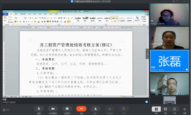 3月12日下午,资产管理处处长张磊利用钉钉平台召开部门新学期资产管理准备工作视频会。 会上,部门人员分别就《beat365中文官网资产管理员考核办法(修订)》和《资产管理处绩效考核方案(修订)》中的考核形式、考...